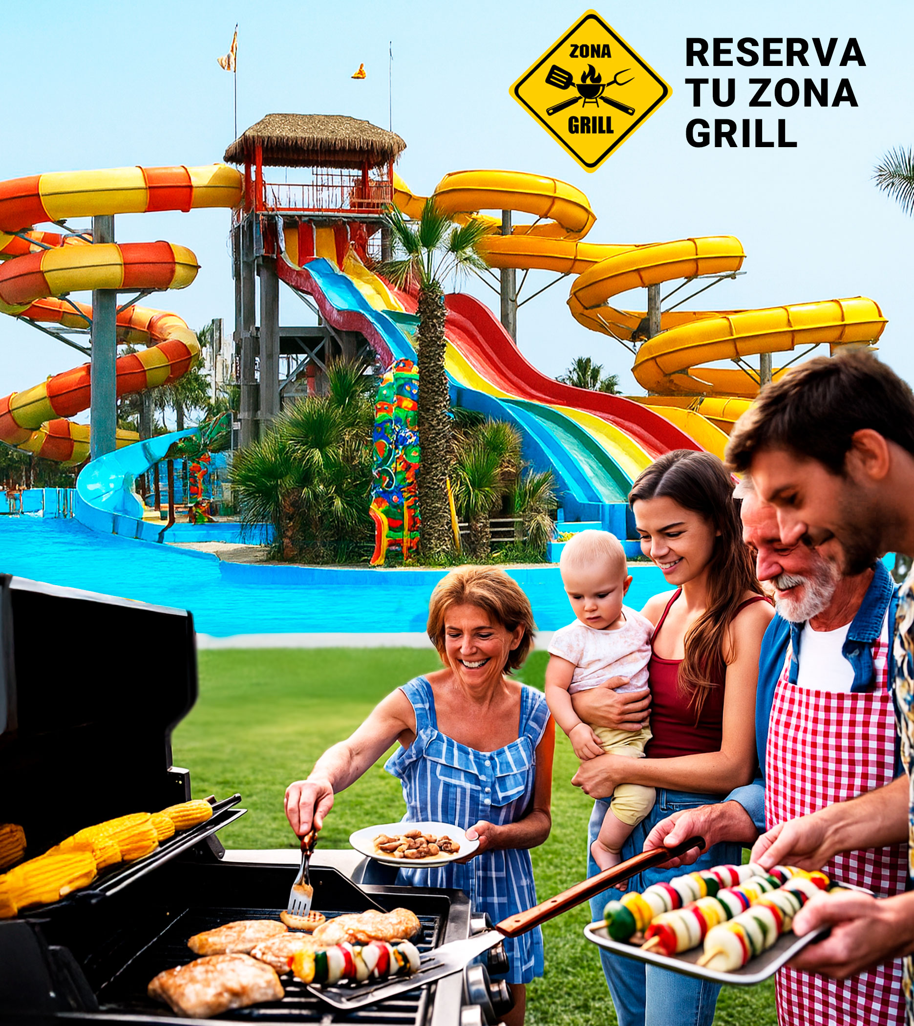 Una piscina de 5000 m2 de extensión y de 1.30 mts. de profundidad, de uso familiar. Una piscina exclusiva para niños de 50 cm con toboganes pequeños.